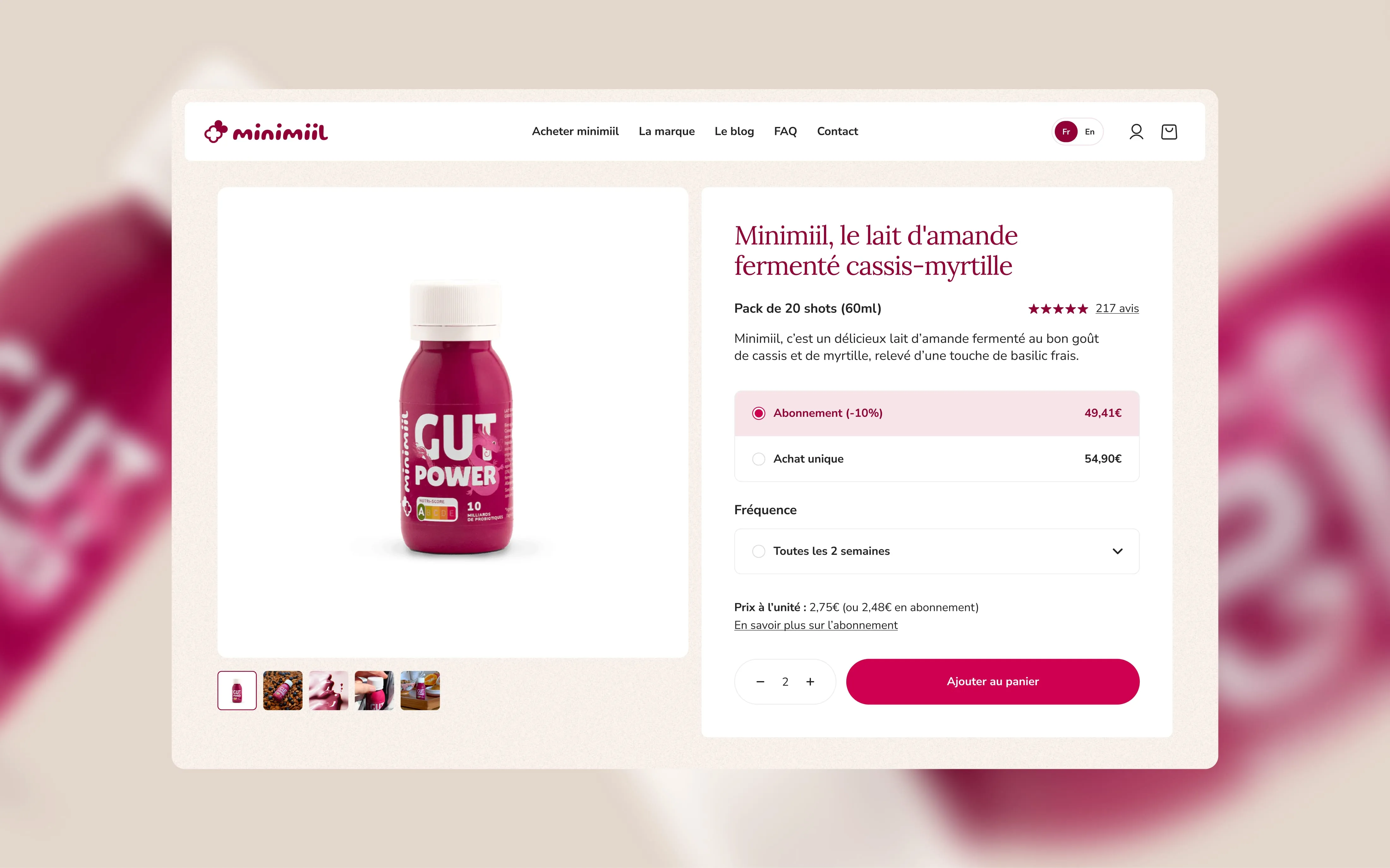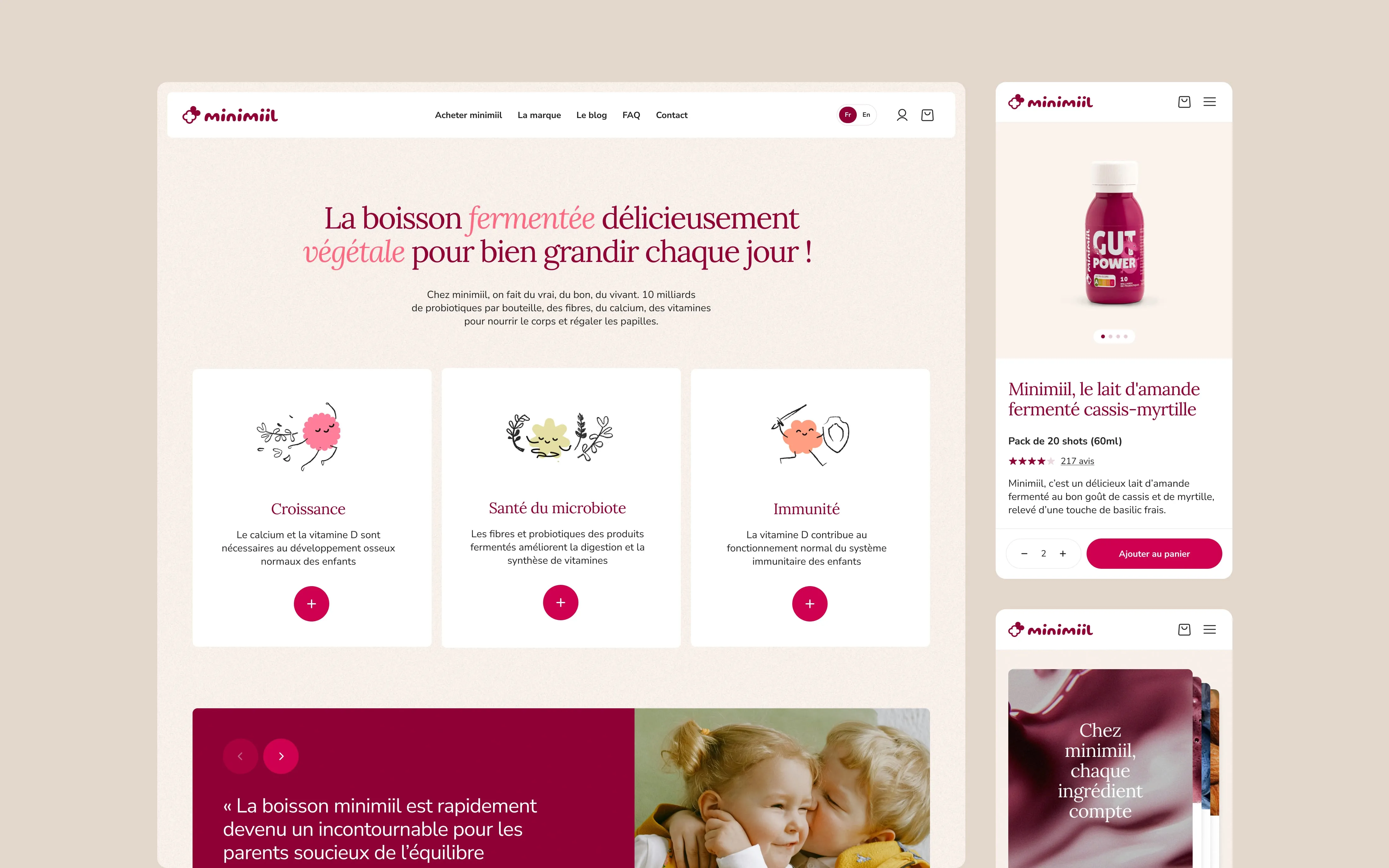 Minimiil est une boisson végétale conçue pour les enfants, à base de probiotiques, de fibres, de vitamines et d’arômes naturels. Un véritable allié pour soutenir la croissance et l’immunité des bambins face aux goûters industriels souvent transformés et trop sucrés. Nous avons conçu avec Minimiil leur premier e-shop pour promouvoir le « Gut power » et les bienfaits de ce super-drink révolutionnaire.